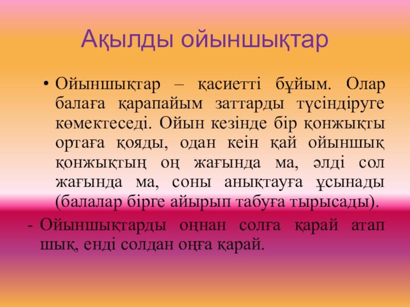 Ойыншықтарды оңнан солға қарай атап шық, енді солдан оңға қарай.
