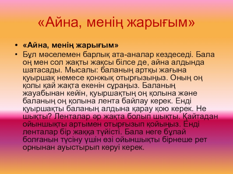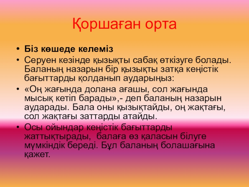 «Оң жағында долана ағашы, сол жағында мысық кетіп барады»,- деп баланың назарын аударады. Бала оны қызықтайды, оң жақтағы, сол жақтағы заттарды атайды.