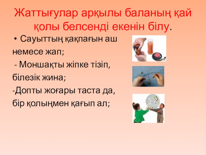 Слайд 8Жаттығулар арқылы баланың қай қолы белсенді екенін білу.