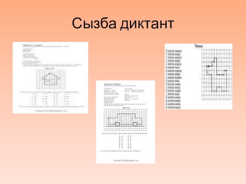 әуенді жаттығулар жасауға болады. Ең басында жаттығулар жеңіл болады. Мысалы: «Оң қолыңды көтер, сол қолыңды жанға соз», содан кейін аяққа арналған жаттығулар: «Оң аяқпен секір! Сол аяқпен секір!», егер бала нақты секіре алса, онда екі аяқпен секіруге тапсырма беріледі. Содан кейін «оң жаққа секір, сол жаққа секір, алға секір, артқа секір» - деп тапсырма беріледі. Еденге жатып, оң аяқты жоғары көтер, енді оң қолыңды көтер (сол жаққа қайталау).