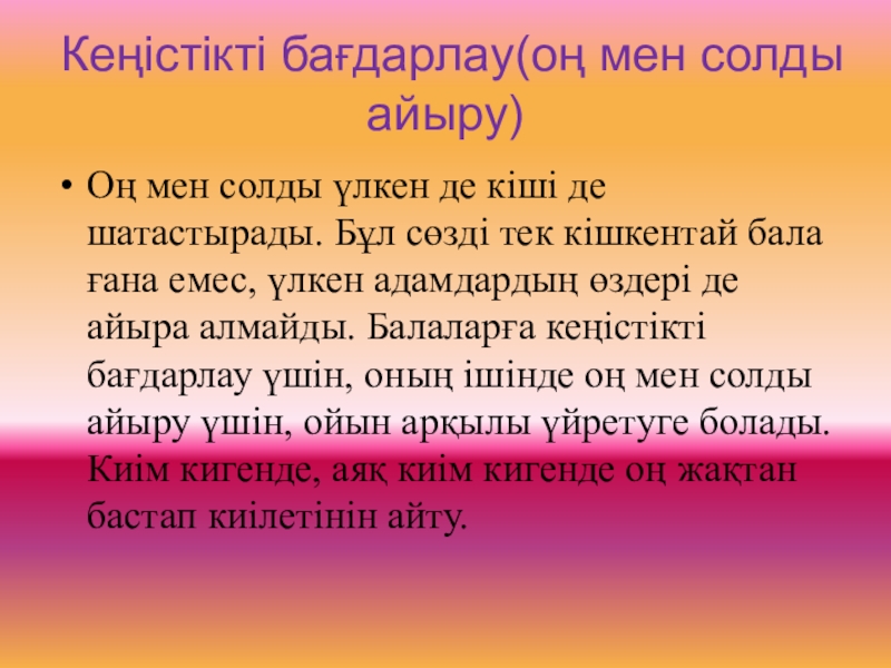 Слайд 4Кеңістікті бағдарлау(оң мен солды айыру)