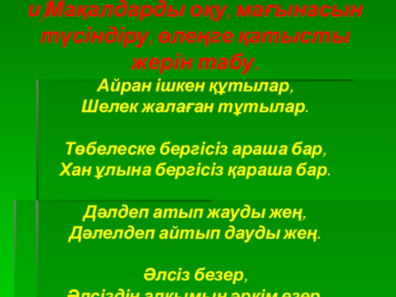Слайд 23и)Мақалдарды оқу, мағынасын түсіндіру, өлеңге қатысты жерін табу.