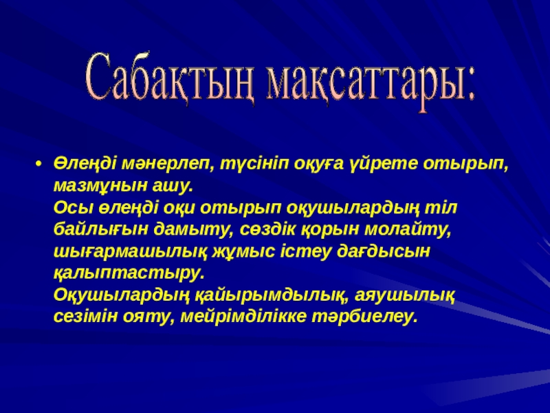 Өлеңді мәнерлеп, түсініп оқуға үйрете отырып, мазмұнын ашу.