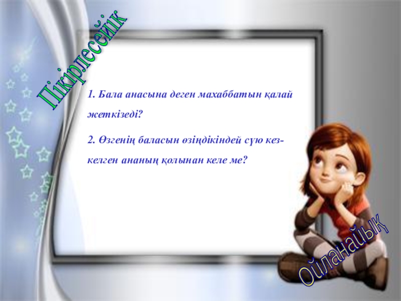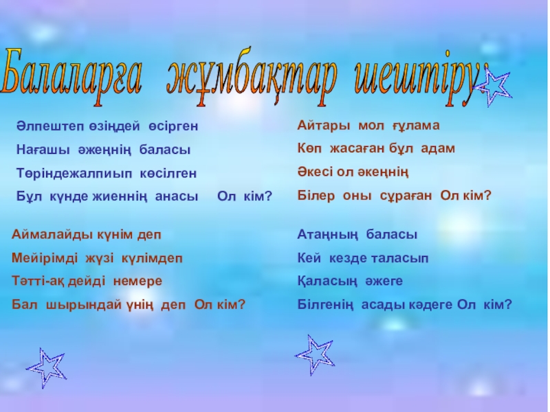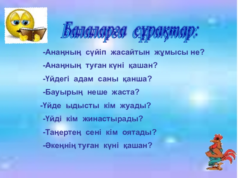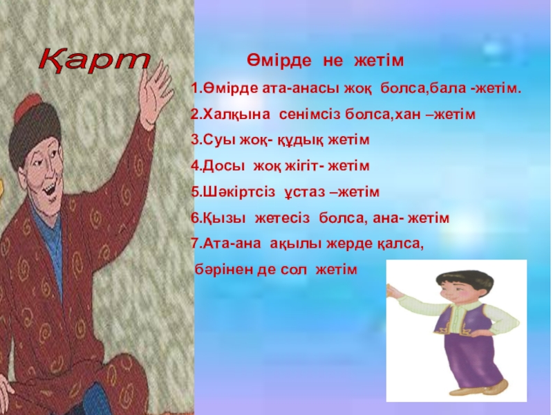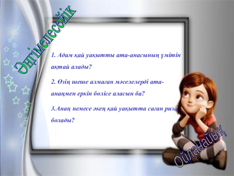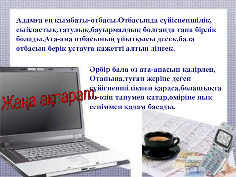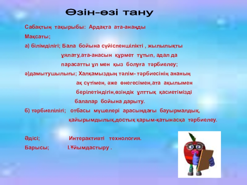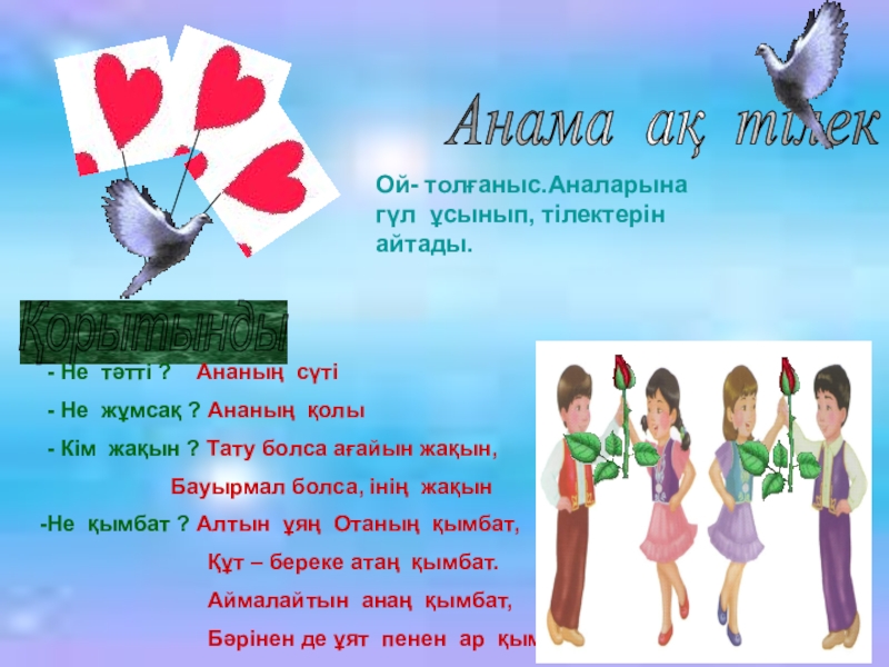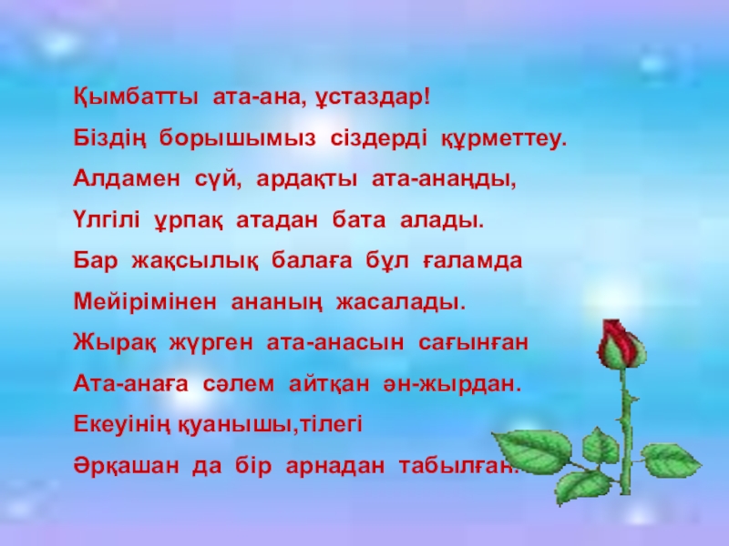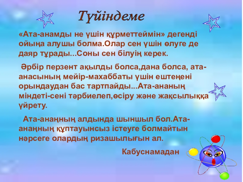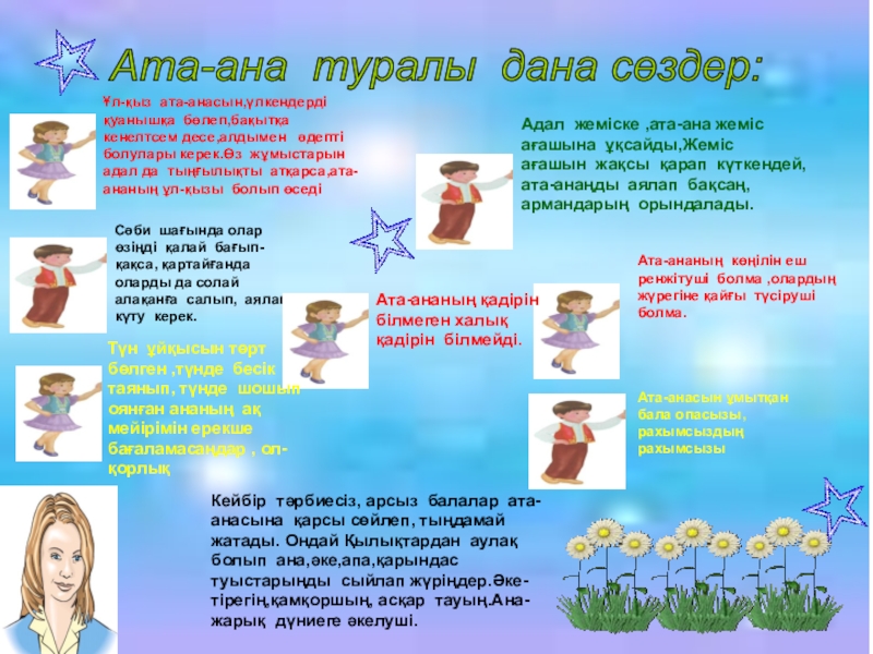 Кейбір тәрбиесіз, арсыз балалар ата-анасына қарсы сөйлеп, тыңдамай жатады. Ондай Қылықтардан аулақ болып ана,әке,апа,қарындас туыстарыңды сыйлап жүріңдер.Әке-тірегің,қамқоршың, асқар тауың.Ана- жарық дүниеге әкелуші.