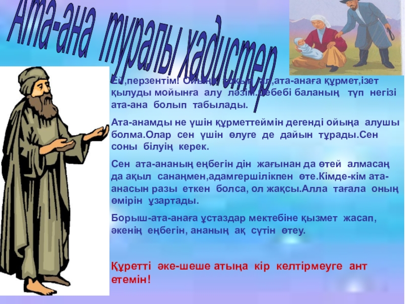 Ата-ананың көңілін еш ренжітуші болма ,олардың жүрегіне қайғы түсіруші болма.