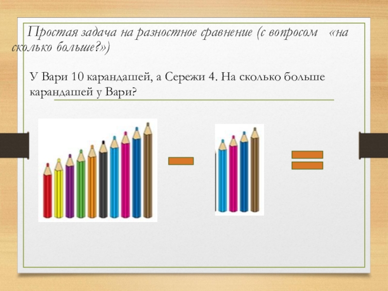 У Вари 10 карандашей, а Сережи 4. На сколько больше карандашей у Вари?