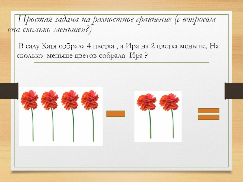 В саду Катя собрала 4 цветка , а Ира на 2 цветка меньше. На сколько меньше цветов собрала Ира ?