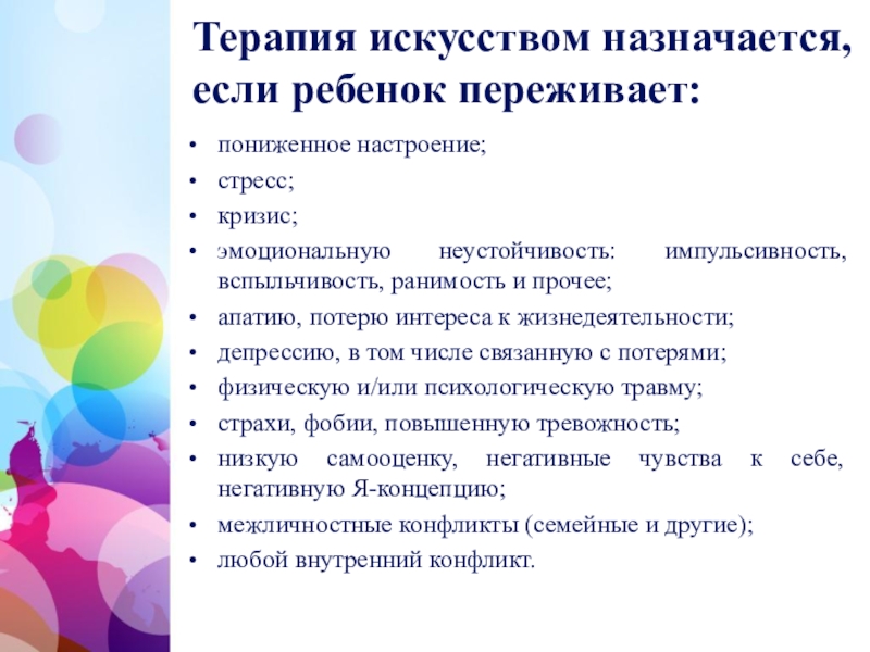 Слайд 4Терапия искусством назначается, если ребенок переживает: