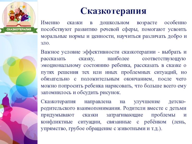 Сказкотерапия направлена на улучшение детско-родительского взаимопонимания. Родители вместе с детьми придумывают сказки затрагивающие проблемы и конфликтные ситуации, связанные с ребёнком (лень, упрямство, грубое обращение с животными и т.д.).
