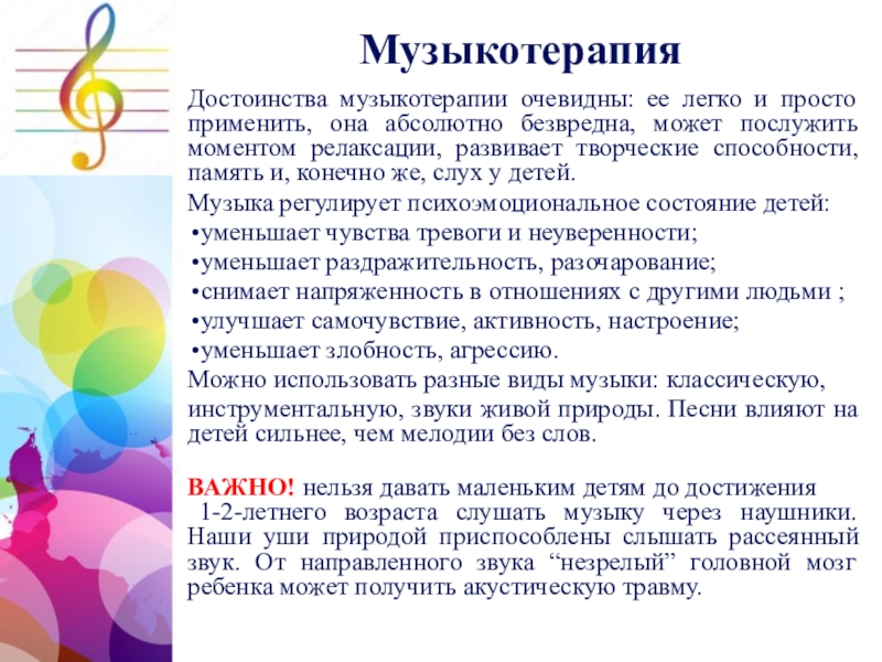 Достоинства музыкотерапии очевидны: ее легко и просто применить, она абсолютно безвредна,