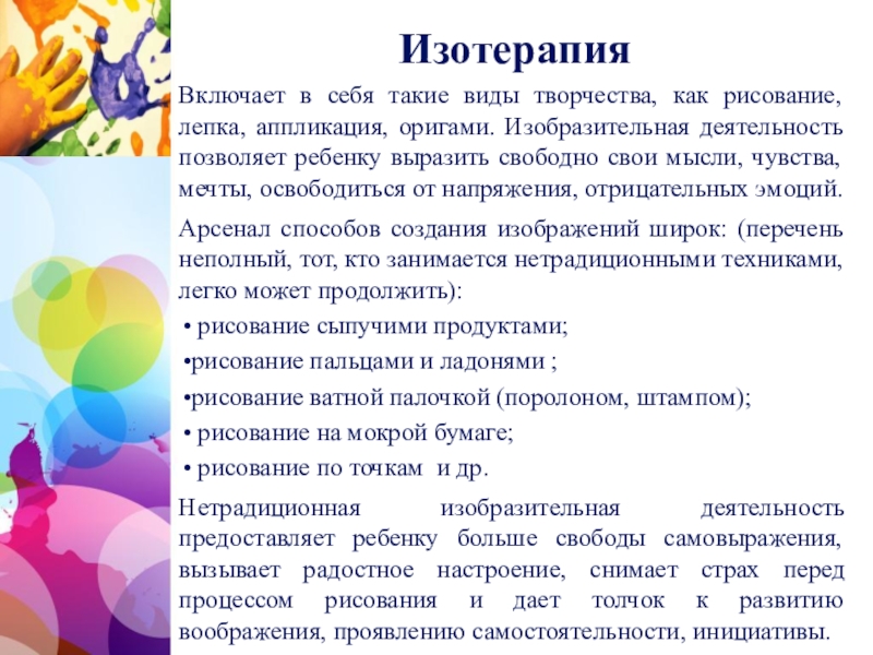 Нетрадиционная изобразительная деятельность предоставляет ребенку больше свободы самовыражения, вызывает радостное настроение, снимает страх перед процессом рисования и дает толчок к развитию воображения, проявлению самостоятельности, инициативы.