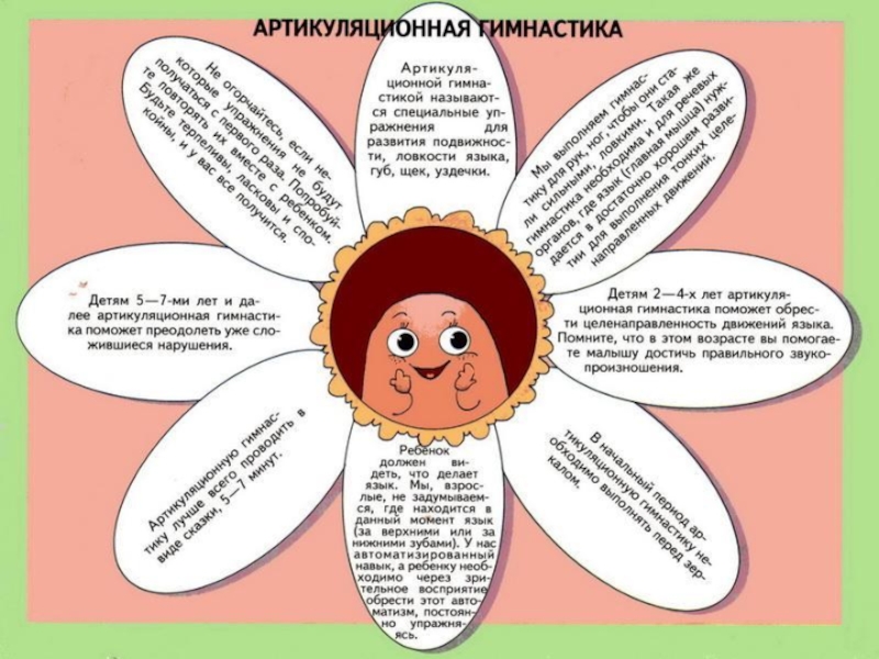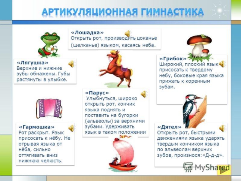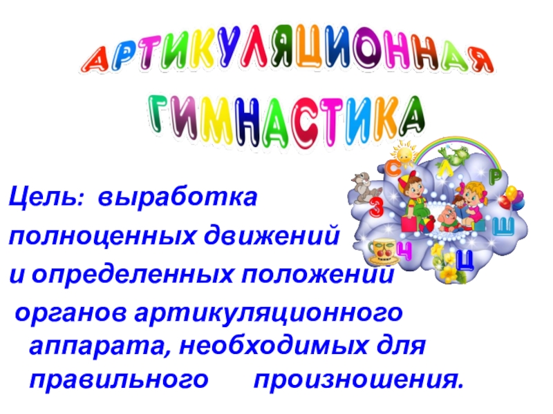 Цель: выработкаполноценных движений и определенных положений органов артикуляционного аппарата, необходимых для правильного произношения.