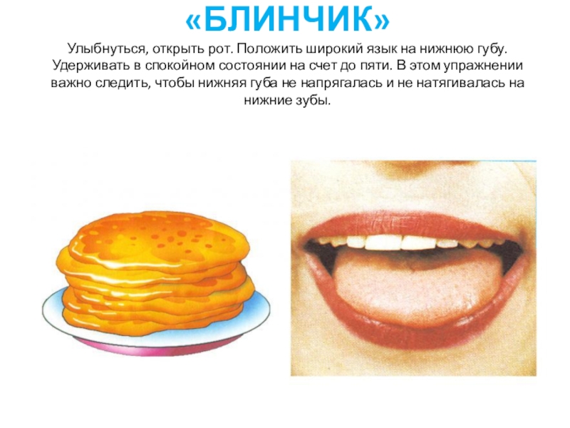 «БЛИНЧИК» Улыбнуться, открыть рот. Положить широкий язык на нижнюю губу. Удерживать в спокойном состоянии на счет до