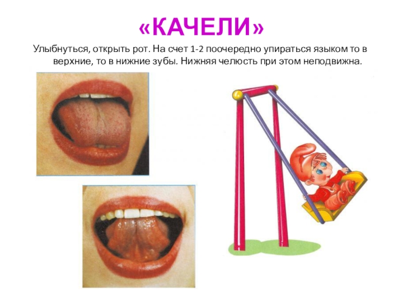 «КАЧЕЛИ»Улыбнуться, открыть рот. На счет 1-2 поочередно упираться языком то в верхние, то в нижние зубы. Нижняя