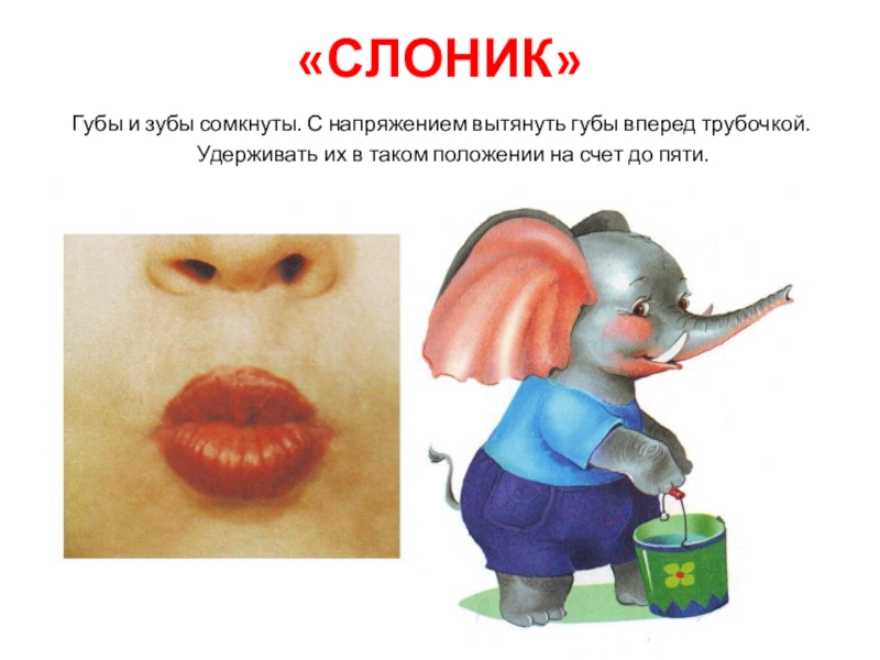 «СЛОНИК» Губы и зубы сомкнуты. С напряжением вытянуть губы вперед трубочкой. Удерживать их в таком положении на