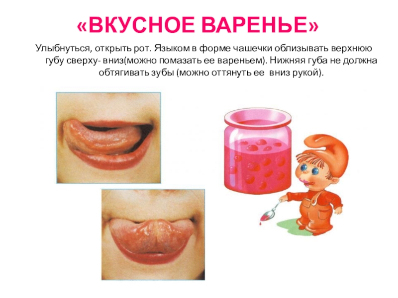 «ВКУСНОЕ ВАРЕНЬЕ»Улыбнуться, открыть рот. Языком в форме чашечки облизывать верхнюю губу сверху- вниз(можно помазать ее вареньем). Нижняя