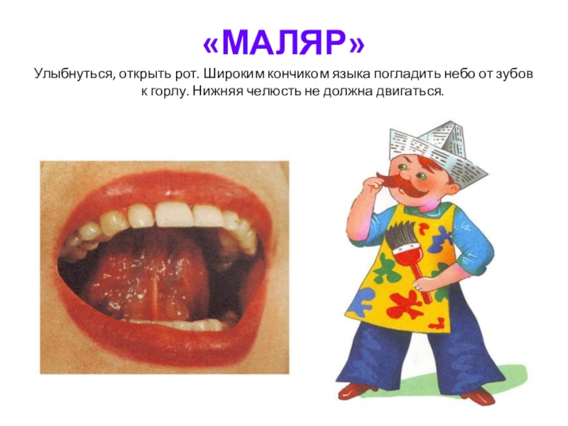 «МАЛЯР»Улыбнуться, открыть рот. Широким кончиком языка погладить небо от зубов к горлу. Нижняя челюсть не должна двигаться.