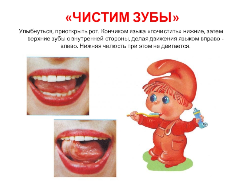 «ЧИСТИМ ЗУБЫ»Улыбнуться, приоткрыть рот. Кончиком языка «почистить» нижние, затем верхние зубы с внутренней стороны, делая движения языком