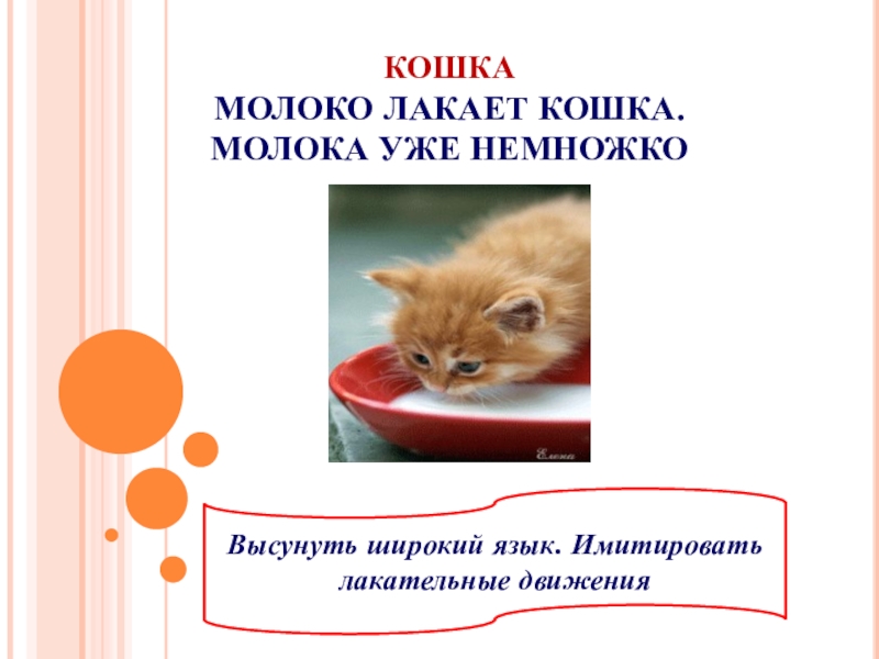 КОШКА МОЛОКО ЛАКАЕТ КОШКА. МОЛОКА УЖЕ НЕМНОЖКО  Высунуть широкий язык. Имитировать лакательные движения
