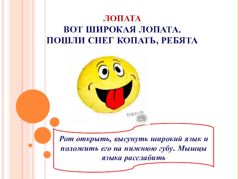 ЛОПАТА ВОТ ШИРОКАЯ ЛОПАТА. ПОШЛИ СНЕГ КОПАТЬ, РЕБЯТА  Рот открыть, высунуть широкий язык и положить его