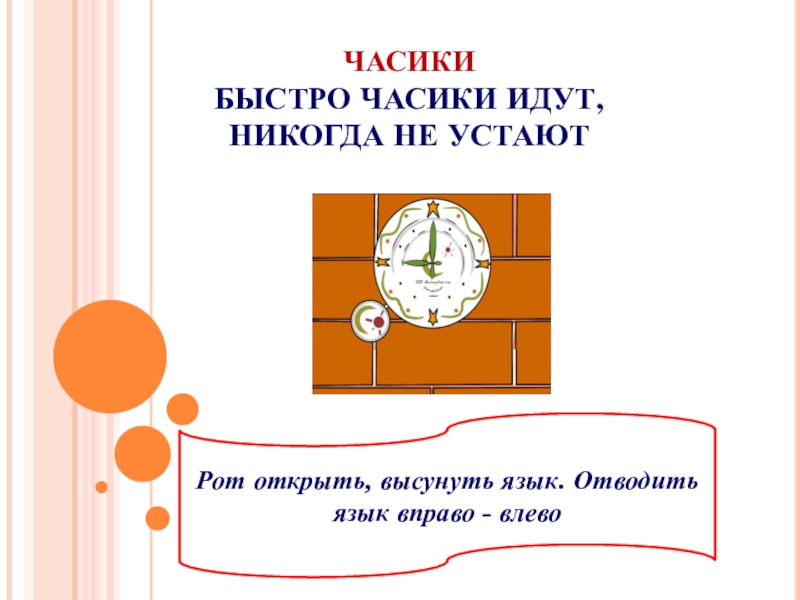 ЧАСИКИ БЫСТРО ЧАСИКИ ИДУТ, НИКОГДА НЕ УСТАЮТ  Рот открыть, высунуть язык. Отводить язык вправо - влево