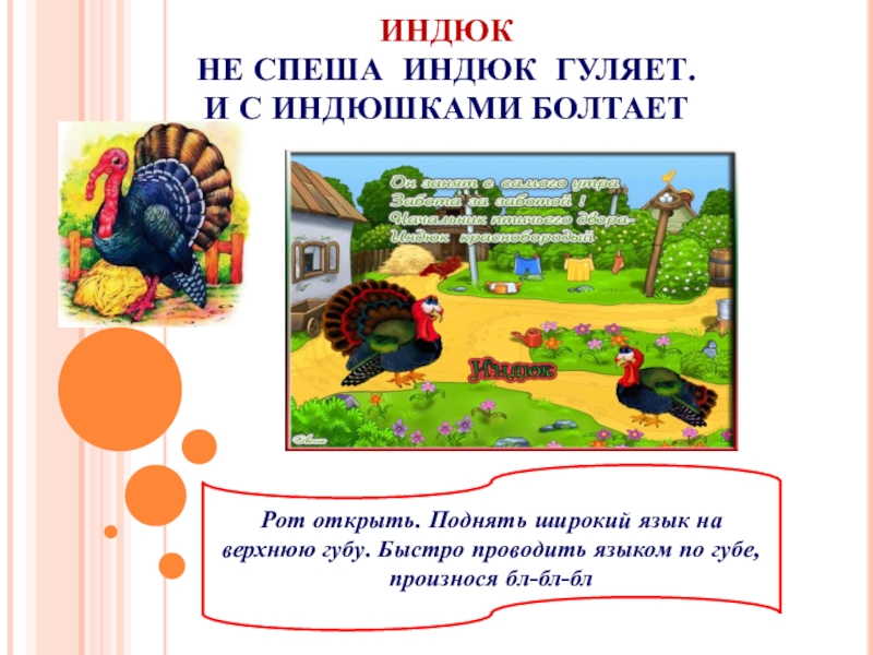 ИНДЮК НЕ СПЕША ИНДЮК ГУЛЯЕТ. И С ИНДЮШКАМИ БОЛТАЕТ    Рот открыть. Поднять широкий язык