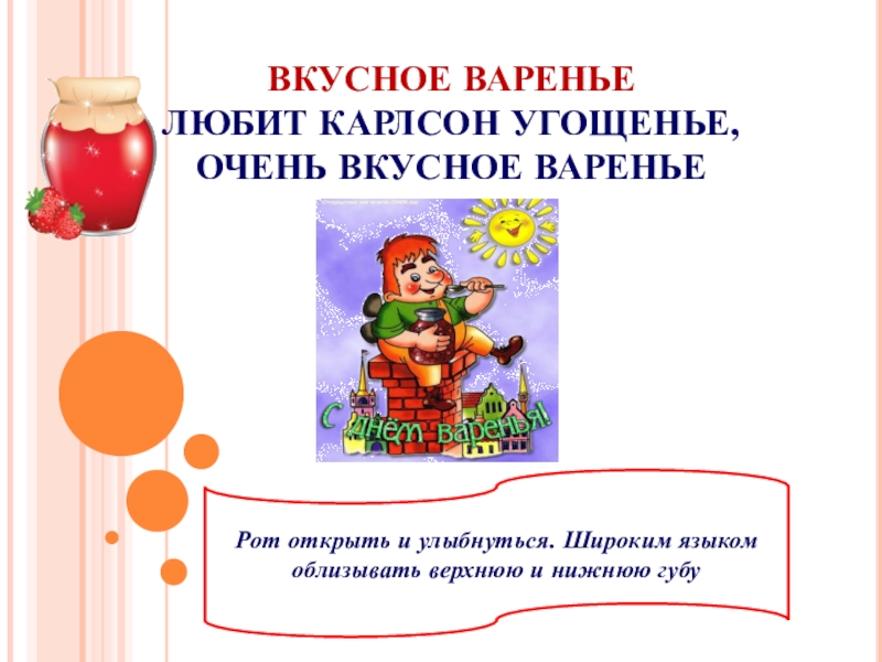ВКУСНОЕ ВАРЕНЬЕ ЛЮБИТ КАРЛСОН УГОЩЕНЬЕ,  ОЧЕНЬ ВКУСНОЕ ВАРЕНЬЕ    Рот открыть и улыбнуться. Широким