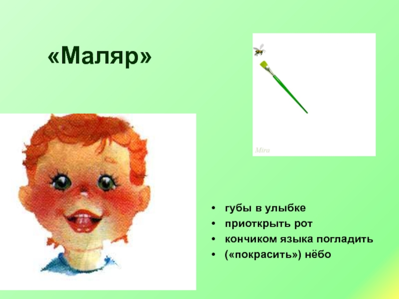 «Маляр»губы в улыбкеприоткрыть роткончиком языка погладить(«покрасить») нёбо