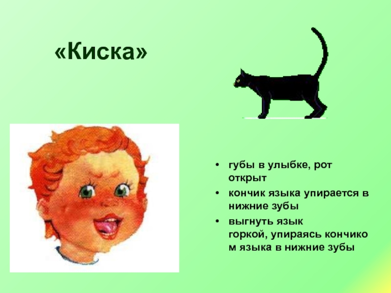 «Киска»губы в улыбке, рот открыт  кончик языка упирается в нижние зубывыгнуть язык горкой, упираясь кончиком языка в нижние зубы