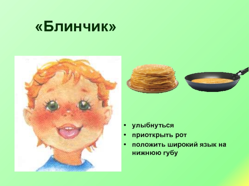 улыбнутьсяприоткрыть ротположить широкий язык на нижнюю губу «Блинчик»