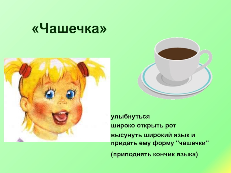 «Чашечка»улыбнутьсяшироко открыть ротвысунуть широкий язык и придать ему форму