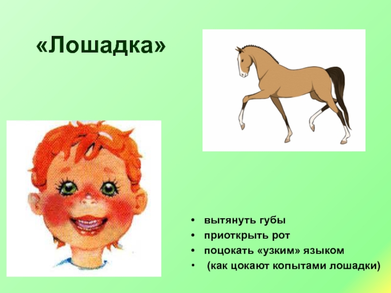 «Лошадка»вытянуть губыприоткрыть рот поцокать «узким» языком (как цокают копытами лошадки)