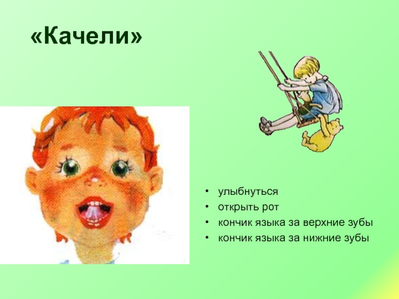 «Качели»улыбнуться открыть рот кончик языка за верхние зубы кончик языка за нижние зубы