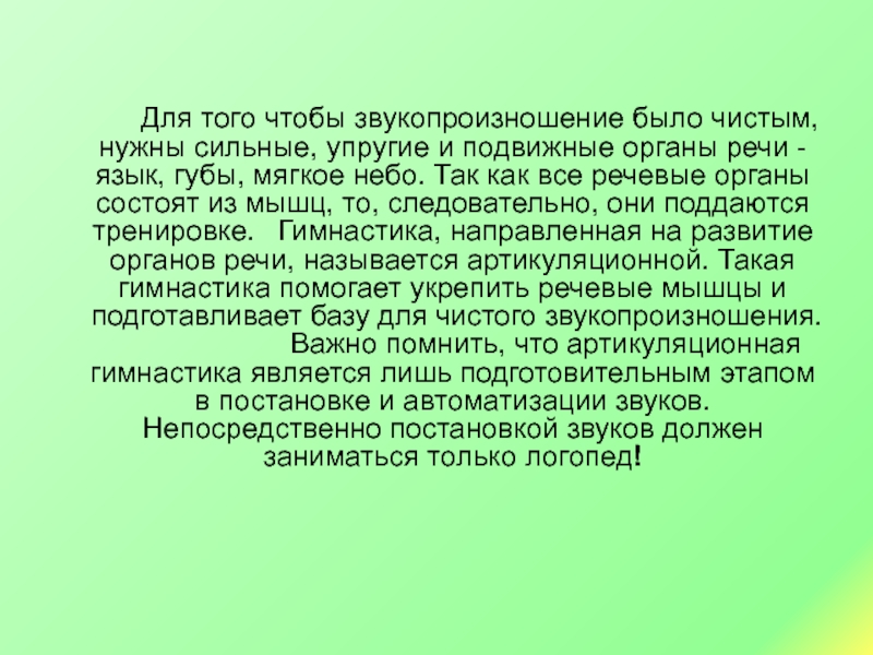 Для того чтобы звукопроизношение было чистым, нужны сильные, упругие и подвижные органы речи - язык, губы, мягкое небо. Так как все речевые органы состоят из мышц, то, следовательно, они поддаются тренировке. Гимнастика, направленная на развитие органов