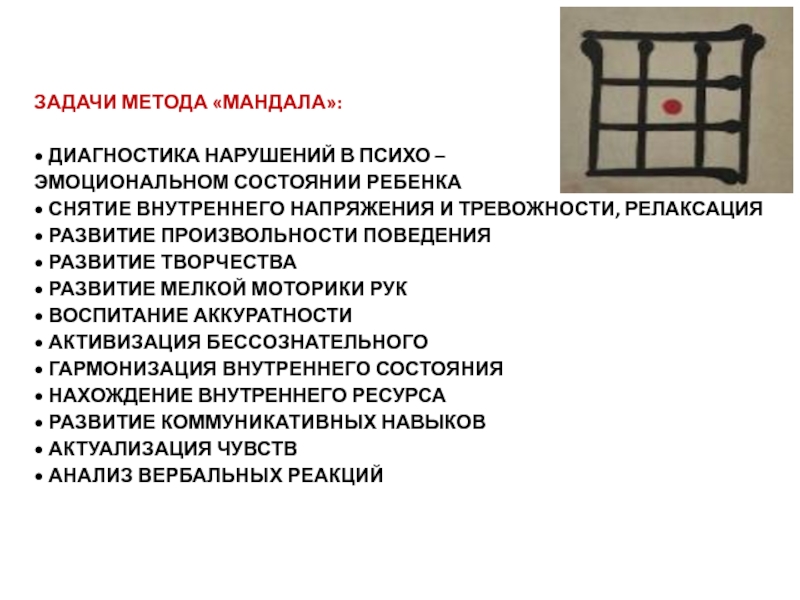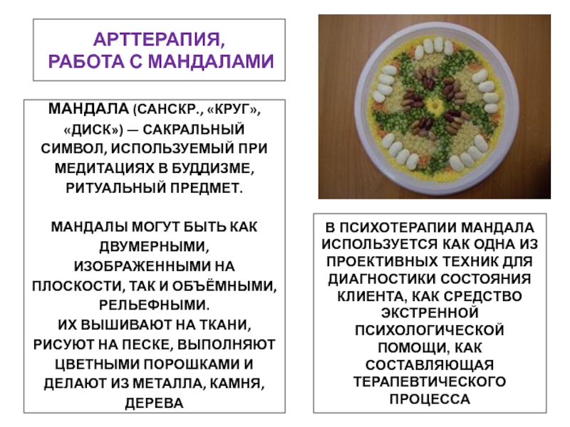 В ПСИХОТЕРАПИИ МАНДАЛА ИСПОЛЬЗУЕТСЯ КАК ОДНА ИЗ ПРОЕКТИВНЫХ ТЕХНИК ДЛЯ ДИАГНОСТИКИ СОСТОЯНИЯ КЛИЕНТА, КАК СРЕДСТВО ЭКСТРЕННОЙ ПСИХОЛОГИЧЕСКОЙ ПОМОЩИ, КАК СОСТАВЛЯЮЩАЯ ТЕРАПЕВТИЧЕСКОГО ПРОЦЕССА