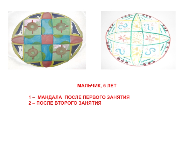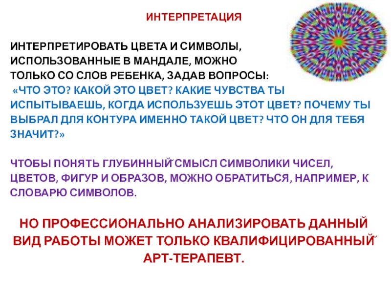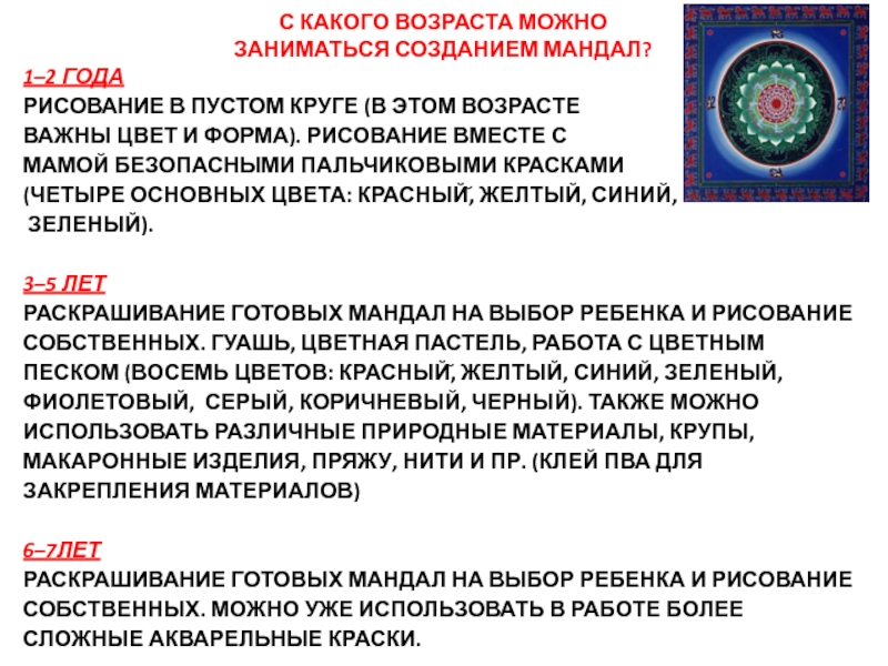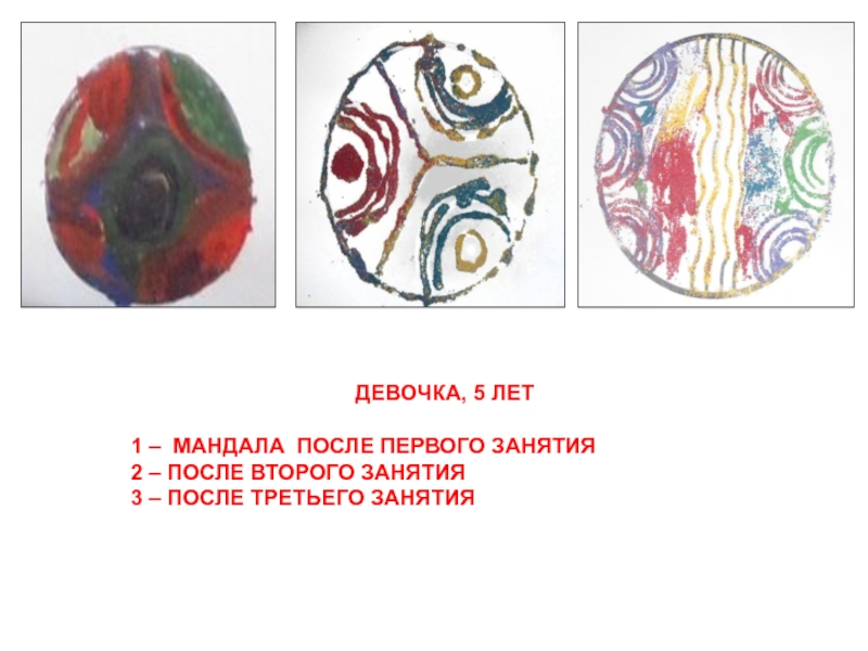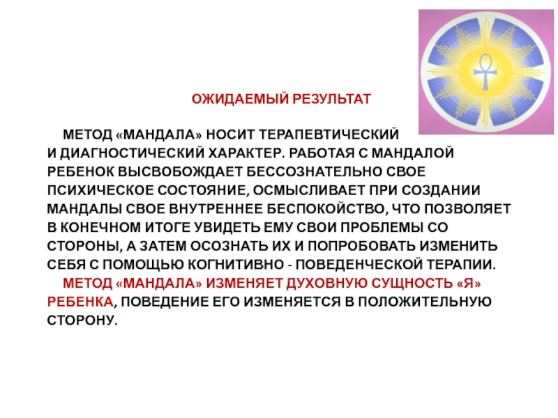 с мандалой ребенок высвобождает бессознательно свое психическое состояние, осмысливает при создании мандалы свое внутреннее беспокойство, что позволяет в конечном итоге увидеть ему свои проблемы со стороны, а затем осознать их и попробовать изменить себя с помощью когнитивно - поведенческой терапии.