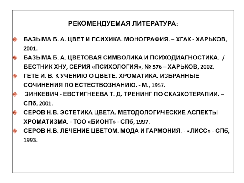 БАЗЫМА Б. А. ЦВЕТОВАЯ СИМВОЛИКА И ПСИХОДИАГНОСТИКА. / ВЕСТНИК ХНУ, СЕРИЯ «ПСИХОЛОГИЯ», № 576 – ХАРЬКОВ, 2002.