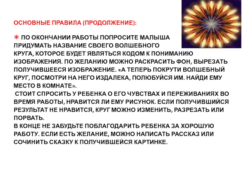 Стоит спросить у ребенка о его чувствах и переживаниях во время работы, нравится ли ему рисунок. Если получившийся результат не нравится, круг можно изменить, разрезать или порвать.