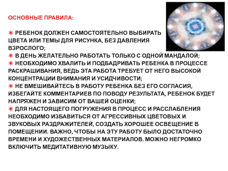 ✽ для настоящего погружения в процесс и расслабления необходимо избавиться от агрессивных цветовых и звуковых раздражителей̆, создать хорошее освещение в помещении. Важно, чтобы на эту работу было достаточно времени и художественных материалов. Можно негромко включить медитативную музыку.