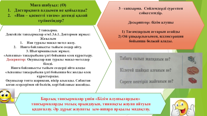 Оқу мақсаттары: 1.1.2.1 – мұғалімнің көмегімен мәтінде кім? (не?) туралы айтылғанын анықтау