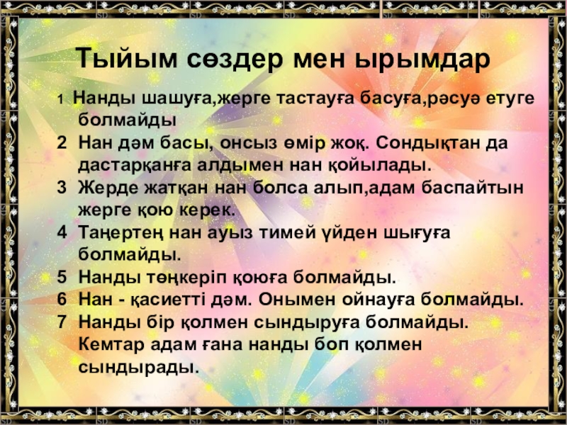 Тыйым сөздер мен ырымдар1 Нанды шашуға,жерге тастауға басуға,рәсуә етуге болмайды2 Нан дәм басы, онсыз өмір жоқ. Сондықтан