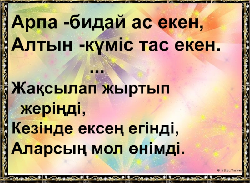 Арпа -бидай ас екен,Алтын -күміс тас екен.        ...Жақсылап жыртып жеріңді,Кезінде