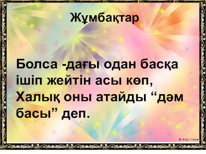 Болса -дағы одан басқа ішіп жейтін асы көп,Халық оны атайды “дәм басы” деп.Жұмбақтар