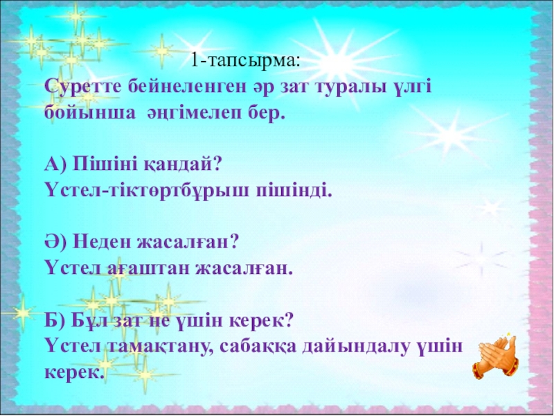 Суретте бейнеленген әр зат туралы үлгі бойынша әңгімелеп бер.