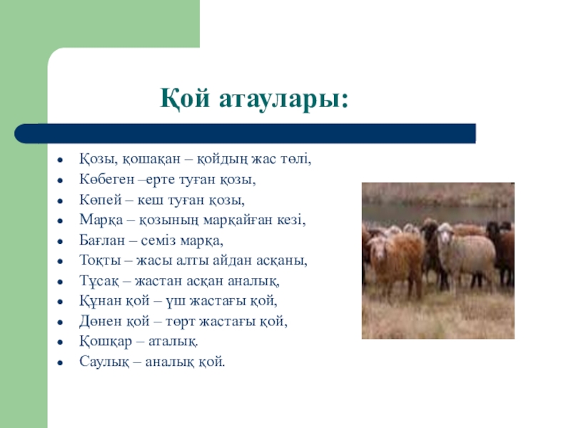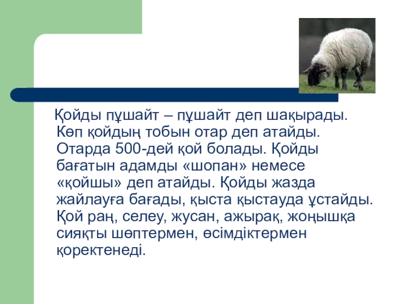 Слайд 9 Қойды пұшайт – пұшайт деп шақырады. Көп қойдың тобын