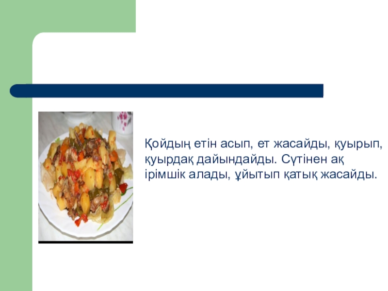 Слайд 13Қойдың етін асып, ет жасайды, қуырып,