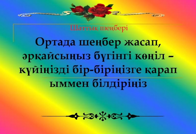 Шаттық шеңберіОртада шеңбер жасап,әрқайсыңыз бүгінгі көңіл –күйіңізді бір-біріңізге қарап ыммен білдіріңіз
