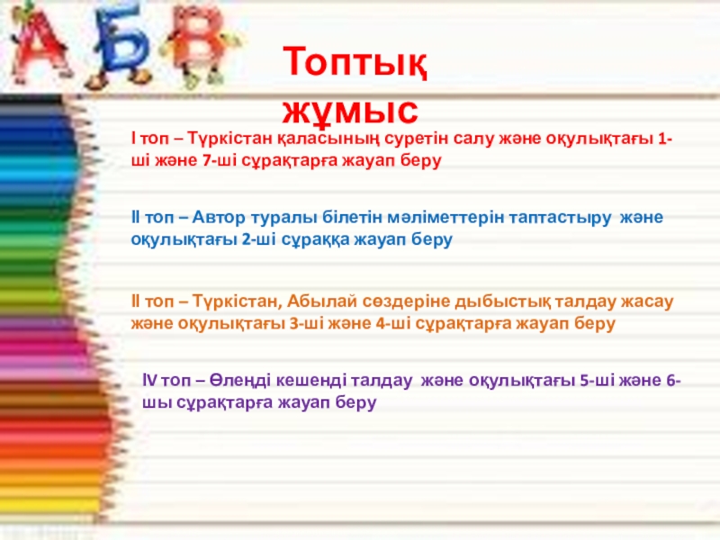 ІІ топ – Түркістан, Абылай сөздеріне дыбыстық талдау жасау және оқулықтағы 3-ші және 4-ші сұрақтарға жауап беру
