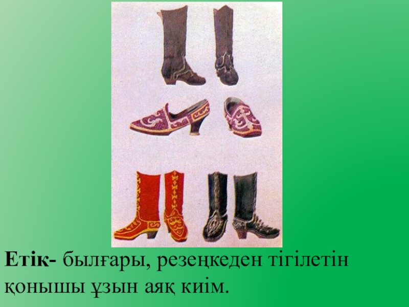 Слайд 8Етік- былғары, резеңкеден тігілетін қонышы ұзын аяқ киім.