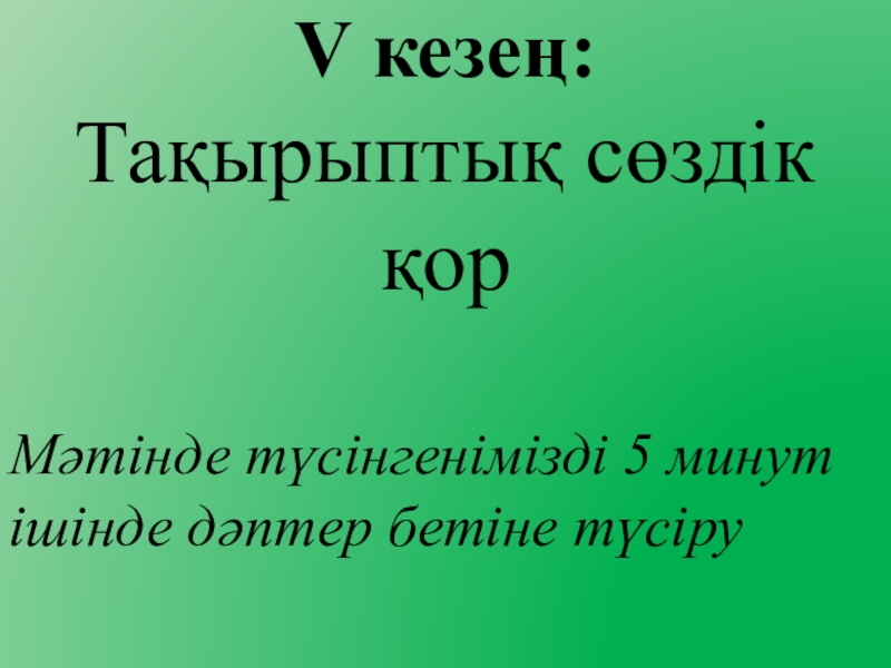 V кезең:  Тақырыптық сөздік қор Мәтінде түсінгенімізді 5 минут ішінде дәптер бетіне түсіру